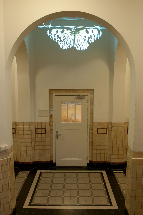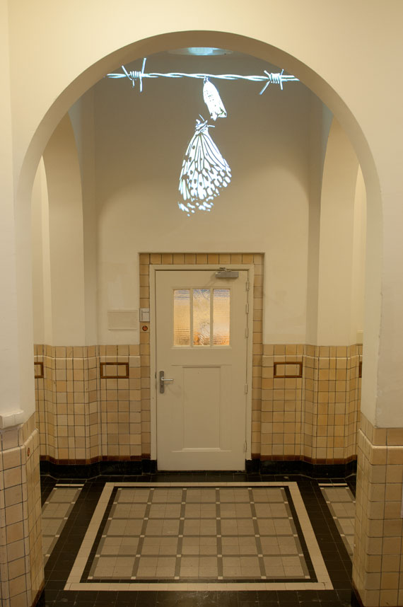 Between two walls of the space a projection of barbed wire can be seen. Between the sharp pins of the wire a caterpillar has made its cocoon. You can see the whole process of the butterfly coming out of its cocoon and developing its wings so it can finally try to fly away from it's imprisonment of the cocoon and the  barbed wire.